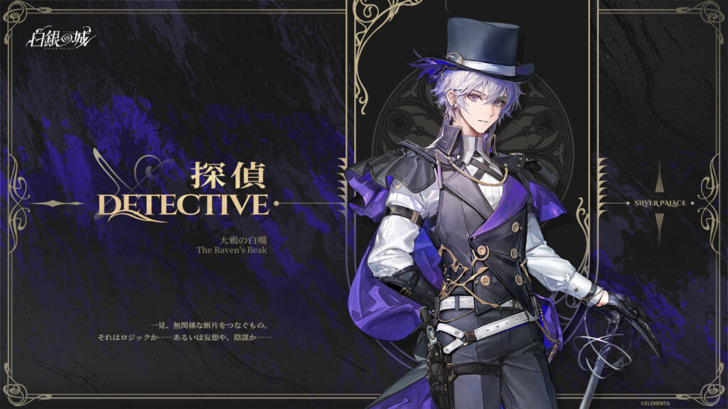 主人公/プレイヤーキャラとして「探偵」という肩書で登場。性別は男性・女性の選択が可能なようで、男性版・女性版それぞれ異なるタイトルが付けられています。男性版「The Raven’s Beak(大鴉の白嘴)」、女性版「The Raven’s Claws(大鴉の鉤爪)」。